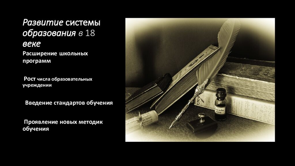 Расширение школьных программ Рост числа образовательных учреждении Введение стандартов обучения Проявление новых методик обучения