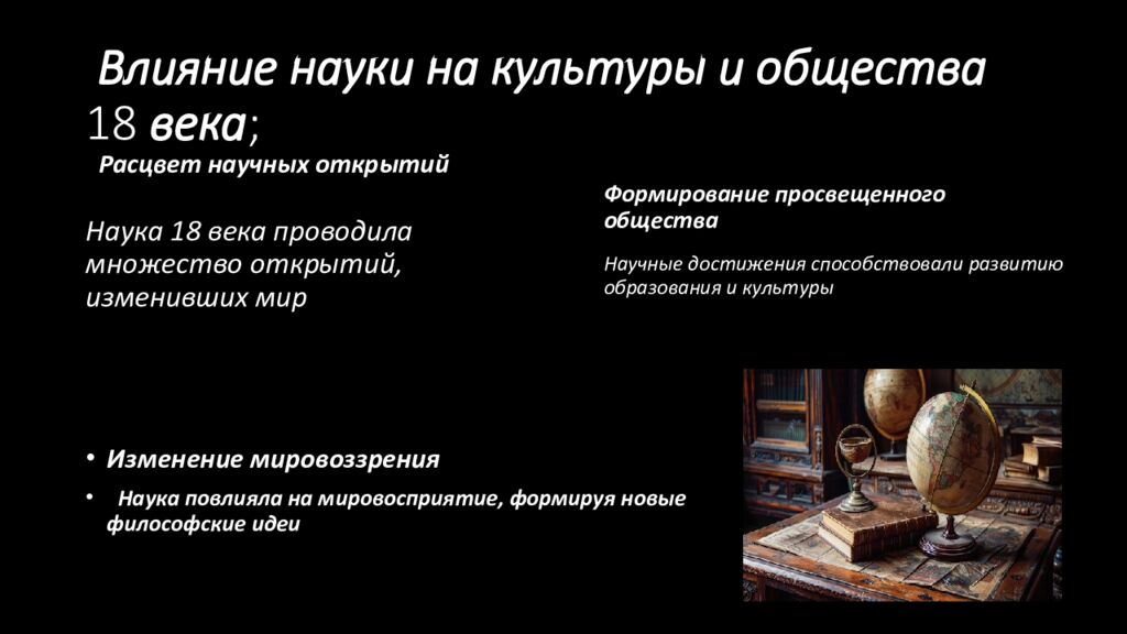 Расцвет научных открытий Наука 18 века проводила множество открытий, изменивших мир Изменение мировоззрения Наука повлияла на мировосприятие, формируя новые философские идеи Формирование просвещенного общества Научные достижения способствовали развитию образования и культуры