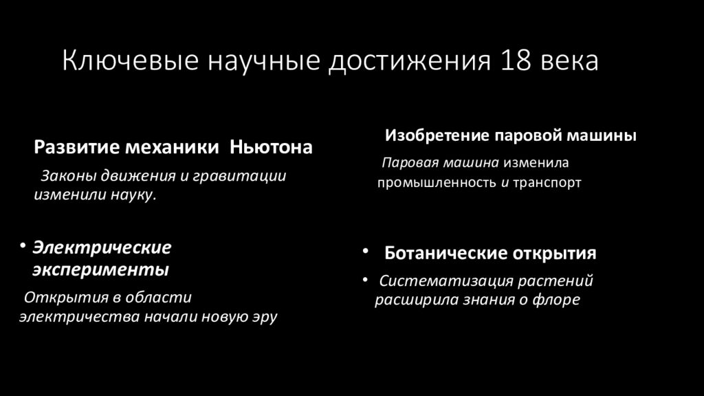 Развитие механики Ньютона Законы движения и гравитации изменили науку. Электрические эксперименты Открытия в области электричества начали новую эру Изобретение паровой машины Паровая машина изменила промышленность и транспорт Ботанические открытия Систематизация растений расширила знания о флоре
