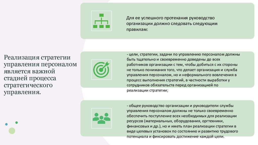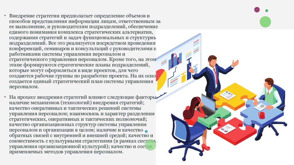 Внедрение стратегии предполагает определение объемов и способов представления информации лицам, ответственным за ее выполнение, и руководителям подразделений, обеспечение единого понимания комплекса стратегических альтернатив, содержания стратегий и задач функциональных и структурных подразделений. Все это реализуется посредством проведения конференций, семинаров и консультаций с руководителями и работниками системы управления персоналом и стратегического управления персоналом. Кроме того, на этом этапе формируются стратегические планы подразделений, которые могут оформляться в виде проектов, для чего создаются рабочие группы по разработке проекта. На их основе создается единый стратегический план системы управления персоналом. На процесс внедрения стратегий влияют следующие факторы: наличие механизмов (технологий) внедрения стратегий; качество оперативных и тактических решений системы управления персоналом; взаимосвязь и характер разделения стратегических, оперативных и тактических полномочий; качество организационных структур системы управления персоналом и организации в целом; наличие и качество обратных связей с внутренней и внешней средой; качество и совместимость с культурными стратегиями (в рамках системы управления организационной культурой); качество и состав применяемых методов управления персоналом.