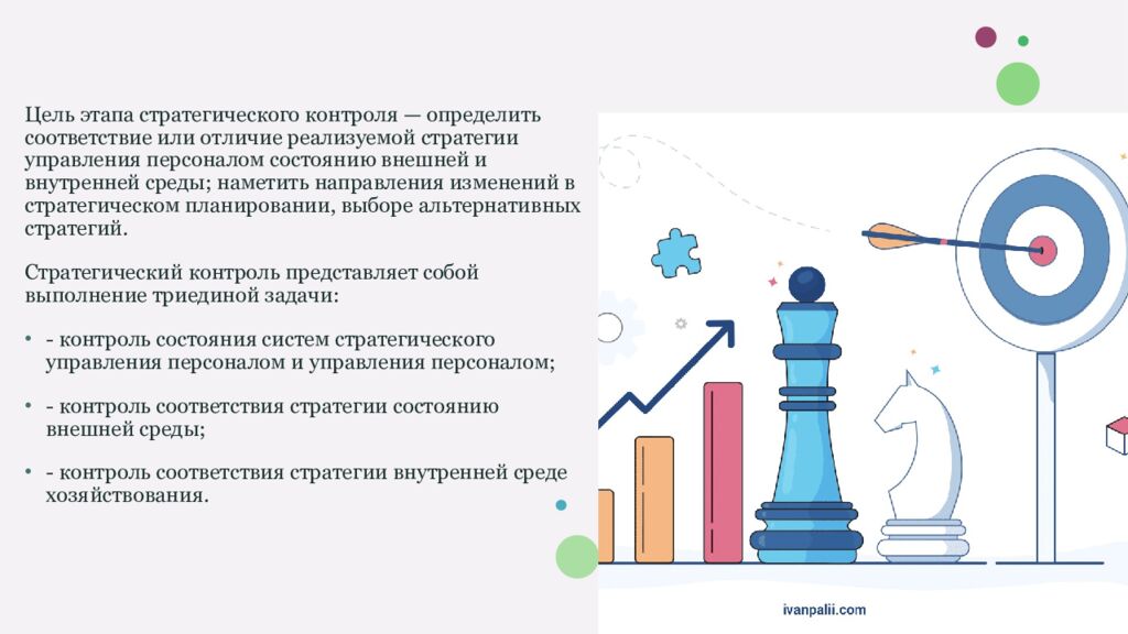 Цель этапа стратегического контроля — определить соответствие или отличие реализуемой стратегии управления персоналом состоянию внешней и внутренней среды; наметить направления изменений в стратегическом планировании, выборе альтернативных стратегий. Стратегический контроль представляет собой выполнение триединой задачи: - контроль состояния систем стратегического управления персоналом и управления персоналом; - контроль соответствия стратегии состоянию внешней среды; - контроль соответствия стратегии внутренней среде хозяйствования.