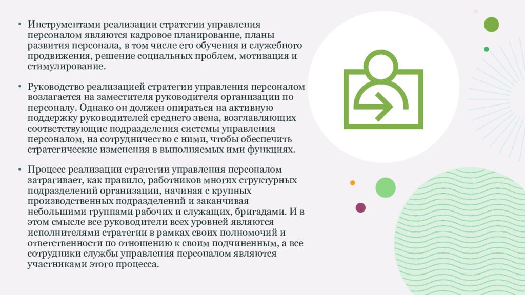 Инструментами реализации стратегии управления персоналом являются кадровое планирование, планы развития персонала, в том числе его обучения и служебного продвижения, решение социальных проблем, мотивация и стимулирование. Руководство реализацией стратегии управления персоналом возлагается на заместителя руководителя организации по персоналу. Однако он должен опираться на активную поддержку руководителей среднего звена, возглавляющих соответствующие подразделения системы управления персоналом, на сотрудничество с ними, чтобы обеспечить стратегические изменения в выполняемых ими функциях. Процесс реализации стратегии управления персоналом затрагивает, как правило, работников многих структурных подразделений организации, начиная с крупных производственных подразделений и заканчивая небольшими группами рабочих и служащих, бригадами. И в этом смысле все руководители всех уровней являются исполнителями стратегии в рамках своих полномочий и ответственности по отношению к своим подчиненным, а все сотрудники службы управления персоналом являются участниками этого процесса.