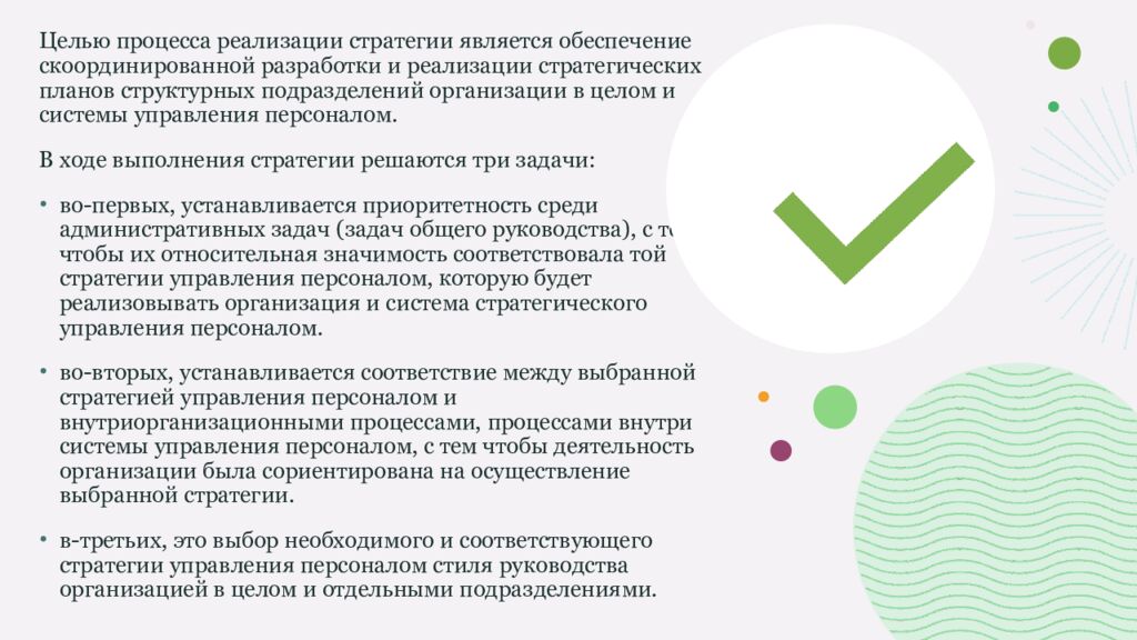 Целью процесса реализации стратегии является обеспечение скоординированной разработки и реализации стратегических планов структурных подразделений организации в целом и системы управления персоналом. В ходе выполнения стратегии решаются три задачи: во-первых, устанавливается приоритетность среди административных задач (задач общего руководства), с тем чтобы их относительная значимость соответствовала той стратегии управления персоналом, которую будет реализовывать организация и система стратегического управления персоналом. во-вторых, устанавливается соответствие между выбранной стратегией управления персоналом и внутриорганизационными процессами, процессами внутри системы управления персоналом, с тем чтобы деятельность организации была сориентирована на осуществление выбранной стратегии. в-третьих, это выбор необходимого и соответствующего стратегии управления персоналом стиля руководства организацией в целом и отдельными подразделениями.