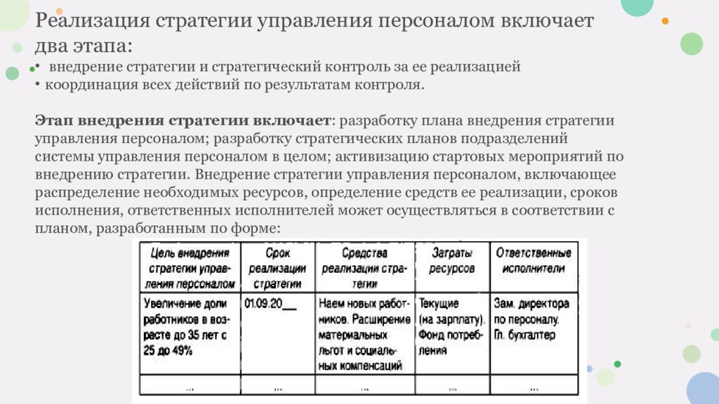 Реализация стратегии управления персоналом включает два этапа: внедрение стратегии и стратегический контроль за ее реализацией координация всех действий по результатам контроля. Этап внедрения стратегии включает : разработку плана внедрения стратегии управления персоналом; разработку стратегических планов подразделений системы управления персоналом в целом; активизацию стартовых мероприятий по внедрению стратегии. Внедрение стратегии управления персоналом, включающее распределение необходимых ресурсов, определение средств ее реализации, сроков исполнения, ответственных исполнителей может осуществляться в соответствии с планом, разработанным по форме: