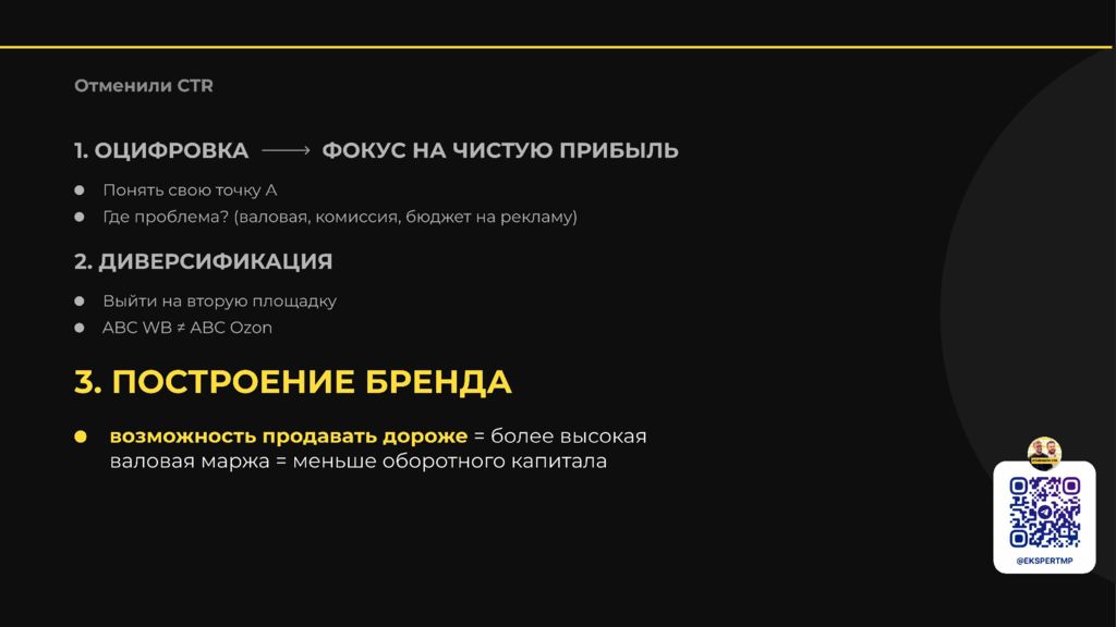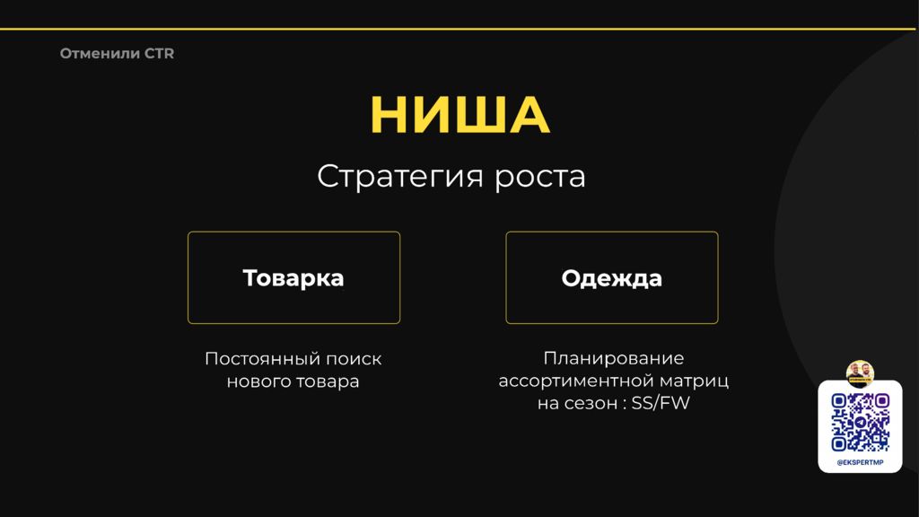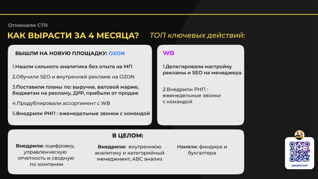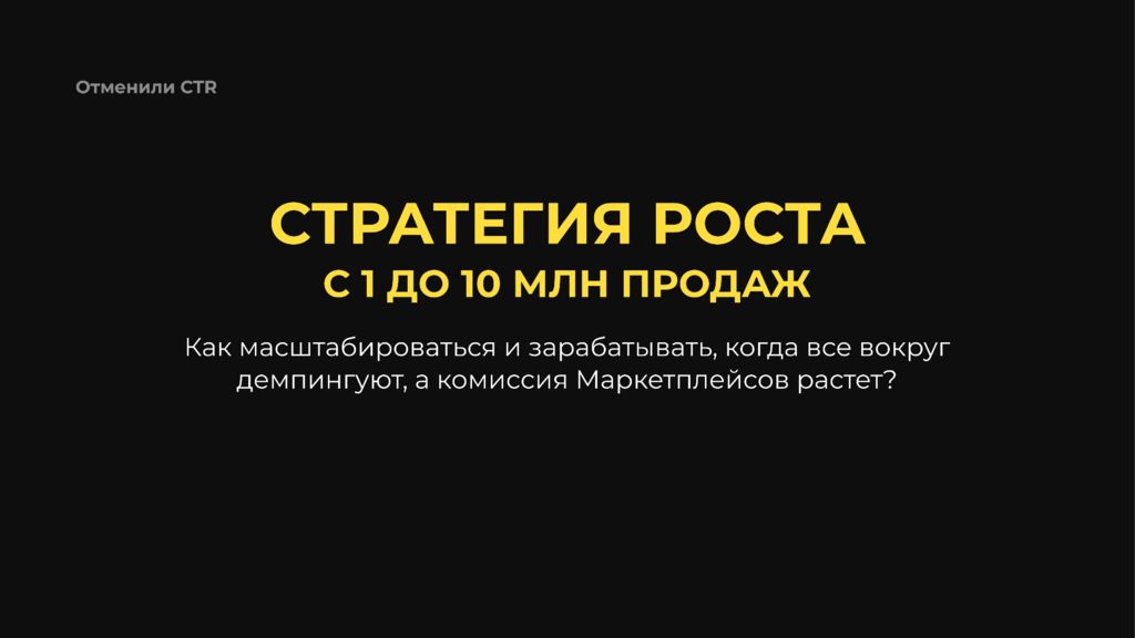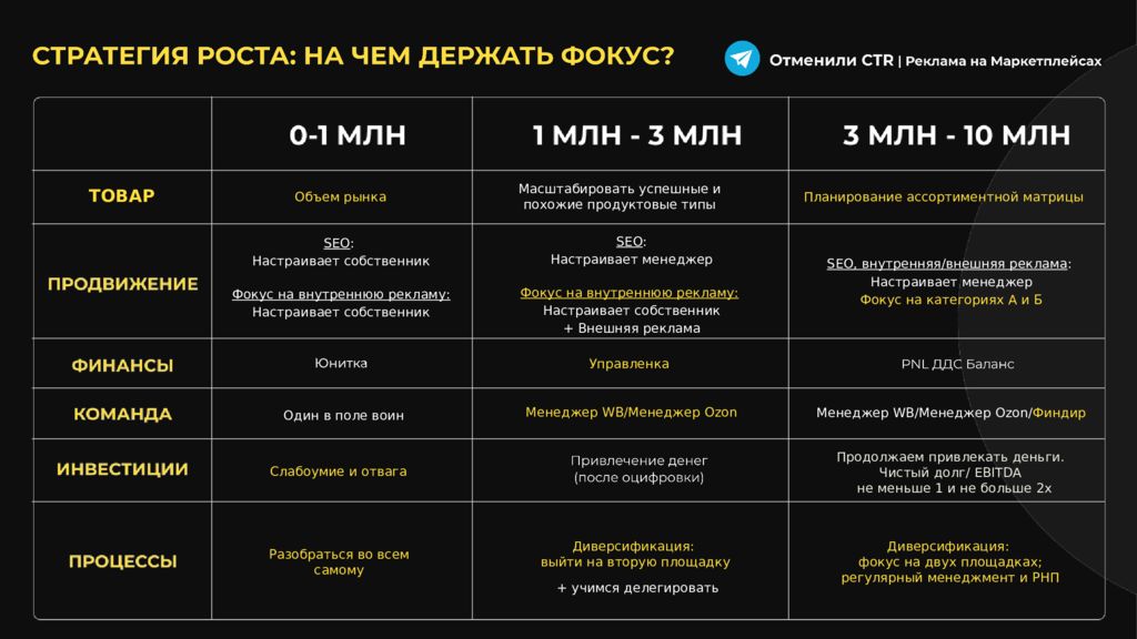 ь Объем рынка Масштабировать успешные и похожие продуктовые типы Планирование ассортиментной матрицы ТОВАР Один в поле воин Слабоумие и отвага + учимся делегировать Продолжаем привлекать деньги. Чистый долг/ EBITDA не меньше 1 и не больше 2х Разобраться во всем самому SEO : Настраивает собственник Фокус на внутреннюю рекламу: На страивает собственник SEO : Настраивает менеджер Фокус на внутреннюю рекламу: На страивает собственник + Внешняя реклама Управленка Менеджер WB/ Менеджер Ozon Диверсификация: выйти на вторую площадку SEO, внутренняя/внешняя реклама : Настраивает менеджер Фокус на категориях A и Б Менеджер WB/ Менеджер Ozon / Финдир Диверсификация: фокус на двух площадках; регулярный менеджмент и РНП