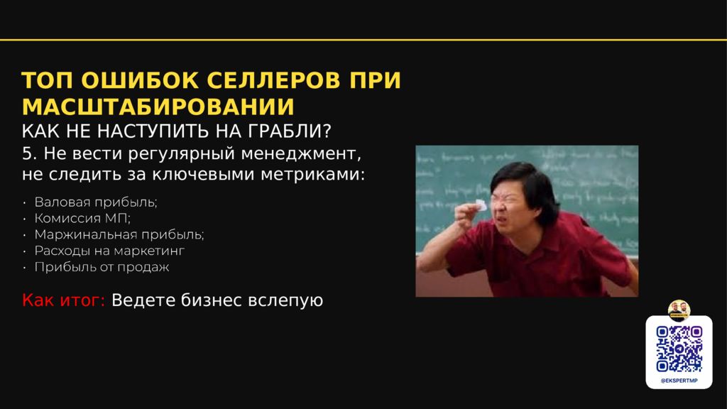 ТОП ОШИБОК СЕЛЛЕРОВ ПРИ МАСШТАБИРОВАНИИ КАК НЕ НАСТУПИТЬ НА ГРАБЛИ? 5. Не вести регулярный менеджмент, не следить за ключевыми метриками: Как итог : Ведете бизнес вслепую
