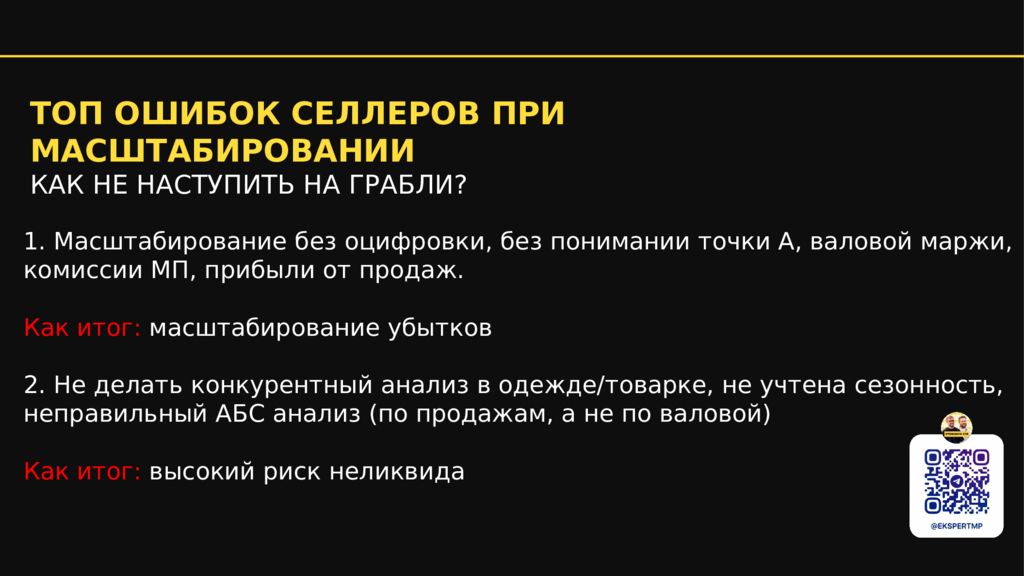 1. Масштабирование без оцифровки, без понимании точки А, валовой маржи, комиссии МП, прибыли от продаж. Как итог : масштабирование убытков 2. Не делать конкурентный анализ в одежде/товарке, не учтена сезонность, неправильный АБС анализ (по продажам, а не по валовой) Как итог : высокий риск неликвида ТОП ОШИБОК СЕЛЛЕРОВ ПРИ МАСШТАБИРОВАНИИ КАК НЕ НАСТУПИТЬ НА ГРАБЛИ?