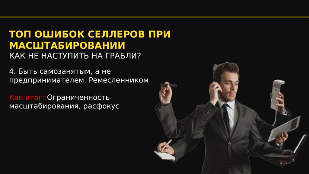 ТОП ОШИБОК СЕЛЛЕРОВ ПРИ МАСШТАБИРОВАНИИ КАК НЕ НАСТУПИТЬ НА ГРАБЛИ? 4. Быть самозанятым, а не предпринимателем. Ремесленником Как итог : Ограниченность масштабирования, расфокус