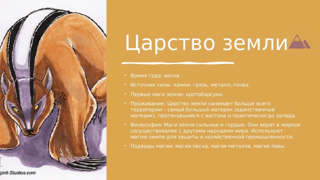 Время года: весна. Источник силы: камни, грязь, металл, почва. Первые маги земли: кротобарсуки. Проживание: Царство земли занимает больше всего территории – самый большой материк (единственный материк), протянувшийся с востока и практически до запада. Философия: Маги земли сильные и гордые. Они верят в мирное сосуществование с другими народами мира. Используют магию земли для защиты и хозяйственной промышленности. Подвиды магии: магия песка, магия металла, магия лавы.