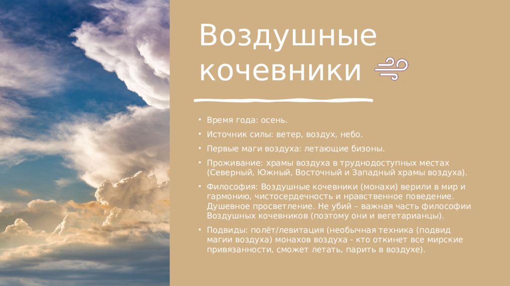 Время года: осень. Источник силы: ветер, воздух, небо. Первые маги воздуха: летающие бизоны. Проживание: храмы воздуха в труднодоступных местах (Северный, Южный, Восточный и Западный храмы воздуха). Философия: Воздушные кочевники (монахи) верили в мир и гармонию, чистосердечность и нравственное поведение. Душевное просветление. Не убий – важная часть философии Воздушных кочевников (поэтому они и вегетарианцы). Подвиды: полёт/левитация (необычная техника (подвид магии воздуха) монахов воздуха - кто откинет все мирские привязанности, сможет летать, парить в воздухе).