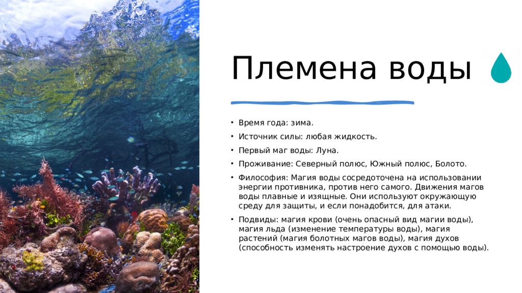 Время года: зима. Источник силы: любая жидкость. Первый маг воды: Луна. Проживание: Северный полюс, Южный полюс, Болото. Философия: Магия воды сосредоточена на использовании энергии противника, против него самого. Движения магов воды плавные и изящные. Они используют окружающую среду для защиты, и если понадобится, для атаки. Подвиды: магия крови (очень опасный вид магии воды), магия льда (изменение температуры воды), магия растений (магия болотных магов воды), магия духов (способность изменять настроение духов с помощью воды).