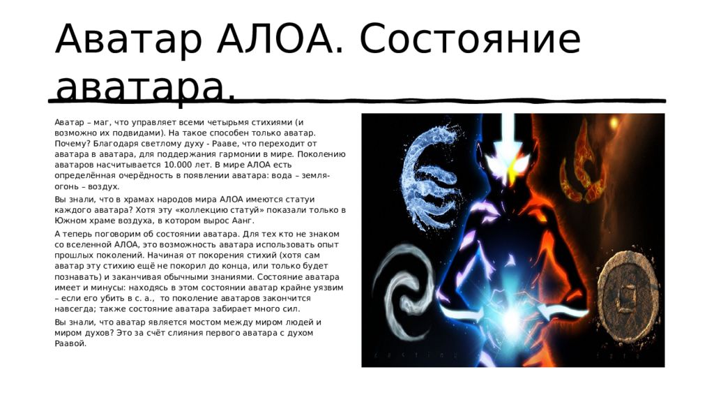 Аватар – маг, что управляет всеми четырьмя стихиями (и возможно их подвидами). На такое способен только аватар. Почему? Благодаря светлому духу - Рааве, что переходит от аватара в аватара, для поддержания гармонии в мире. Поколению аватаров насчитывается 10.000 лет. В мире АЛОА есть определённая очерёдность в появлении аватара: вода – земля- огонь – воздух. Вы знали, что в храмах народов мира АЛОА имеются статуи каждого аватара? Хотя эту «коллекцию статуй» показали только в Южном храме воздуха, в котором вырос Аанг. А теперь поговорим об состоянии аватара. Для тех кто не знаком со вселенной АЛОА, это возможность аватара использовать опыт прошлых поколений. Начиная от покорения стихий (хотя сам аватар эту стихию ещё не покорил до конца, или только будет познавать) и заканчивая обычными знаниями. Состояние аватара имеет и минусы: находясь в этом состоянии аватар крайне уязвим – если его убить в с. а., то поколение аватаров закончится навсегда; также состояние аватара забирает много сил. Вы знали, что аватар является мостом между миром людей и миром духов? Это за счёт слияния первого аватара с духом Раавой.