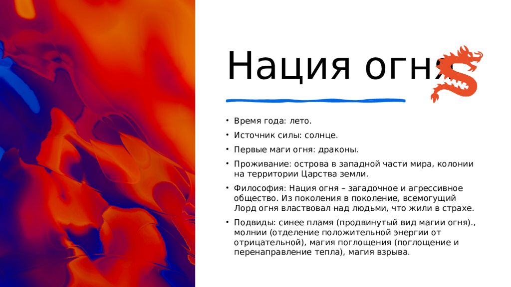 Время года: лето. Источник силы: солнце. Первые маги огня: драконы. Проживание: острова в западной части мира, колонии на территории Царства земли. Философия: Нация огня – загадочное и агрессивное общество. Из поколения в поколение, всемогущий Лорд огня властвовал над людьми, что жили в страхе. Подвиды: синее пламя (продвинутый вид магии огня)., молнии (отделение положительной энергии от отрицательной), магия поглощения (поглощение и перенаправление тепла), магия взрыва.