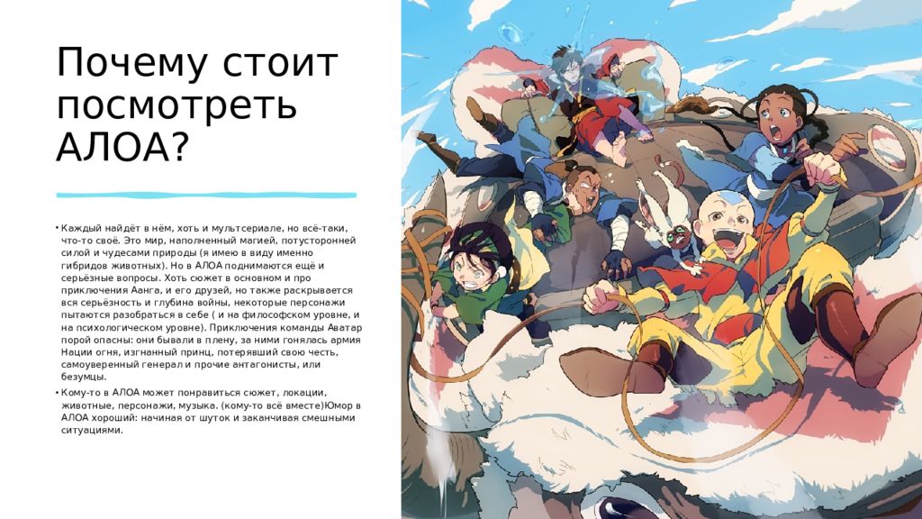 Каждый найдёт в нём, хоть и мультсериале, но всё-таки, что-то своё. Это мир, наполненный магией, потусторонней силой и чудесами природы (я имею в виду именно гибридов животных). Но в АЛОА поднимаются ещё и серьёзные вопросы. Хоть сюжет в основном и про приключения Аанга, и его друзей, но также раскрывается вся серьёзность и глубина войны, некоторые персонажи пытаются разобраться в себе ( и на философском уровне, и на психологическом уровне). Приключения команды Аватар порой опасны: они бывали в плену, за ними гонялась армия Нации огня, изгнанный принц, потерявший свою честь, самоуверенный генерал и прочие антагонисты, или безумцы. Кому-то в АЛОА может понравиться сюжет, локации, животные, персонажи, музыка. (кому-то всё вместе)Юмор в АЛОА хороший: начиная от шуток и заканчивая смешными ситуациями.