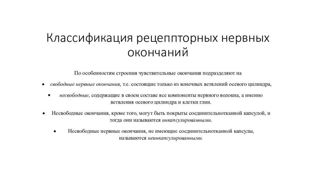 По особенностям строения чувствительные окончания подразделяют на свободные нервные окончания, т.е. состоящие только из конечных ветвлений осевого цилиндра, несвободные, содержащие в своем составе все компоненты нервного волокна, а именно ветвления осевого цилиндра и клетки глии. Несвободные окончания, кроме того, могут быть покрыты соединительнотканной капсулой, и тогда они называются инкапсулированными. Несвободные нервные окончания, не имеющие соединительнотканной капсулы, называются неинкапсулированными.