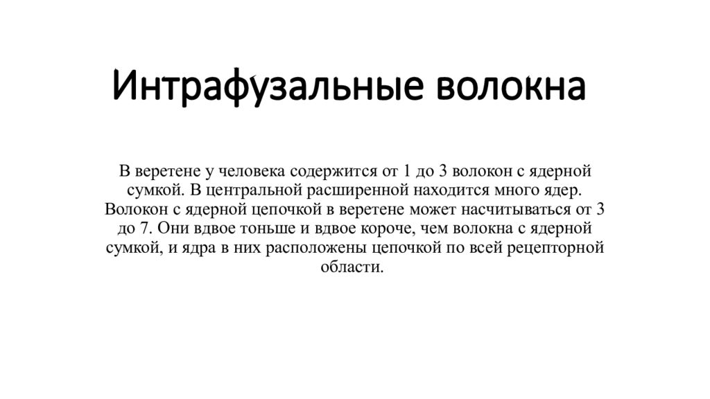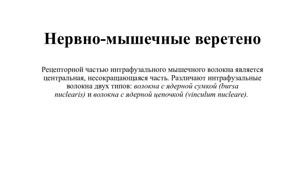 Рецепторной частью интрафузального мышечного волокна является центральная, несокращающаяся часть. Различают интрафузальные волокна двух типов: волокна с ядерной сумкой ( bursa nuclearis ) и волокна с ядерной цепочкой ( vinculum nucleare ).