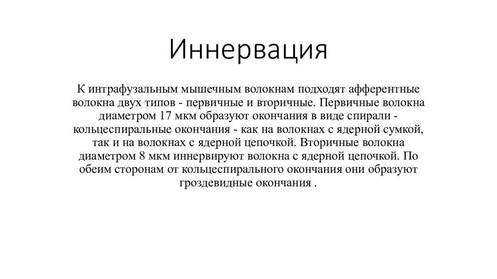 К интрафузальным мышечным волокнам подходят афферентные волокна двух типов - первичные и вторичные. Первичные волокна диаметром 17 мкм образуют окончания в виде спирали - кольцеспиральные окончания - как на волокнах с ядерной сумкой, так и на волокнах с ядерной цепочкой. Вторичные волокна диаметром 8 мкм иннервируют волокна с ядерной цепочкой. По обеим сторонам от кольцеспирального окончания они образуют гроздевидные окончания .