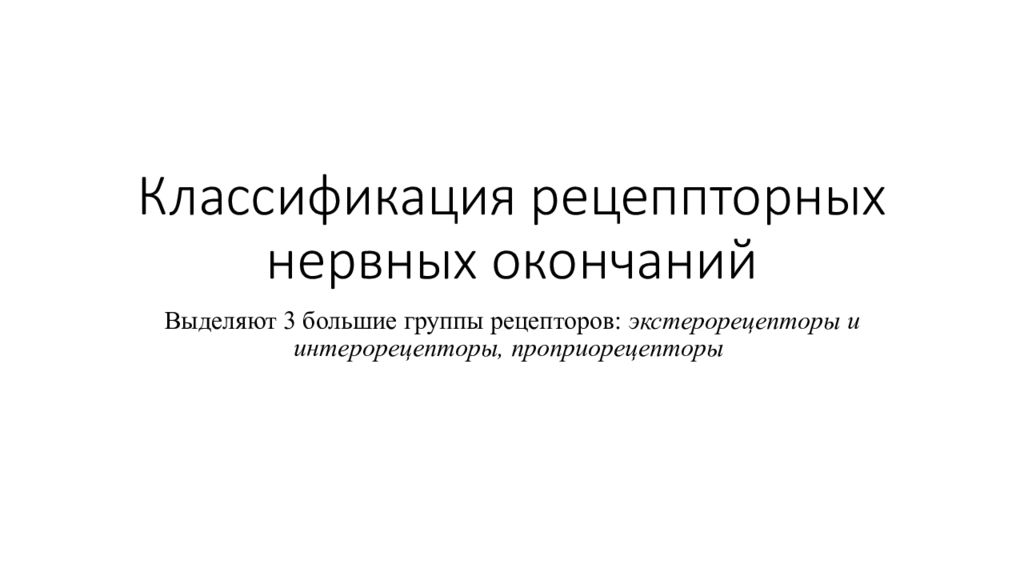 В ыделяют 3 большие группы рецепторов: экстерорецепторы и интерорецепторы, проприорецепторы