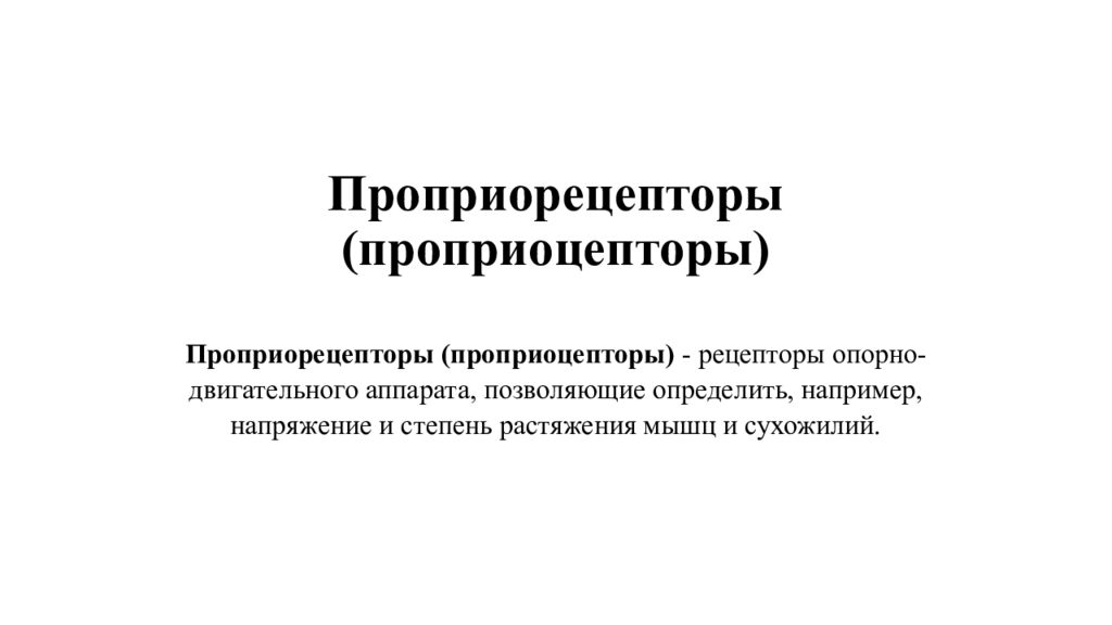 Проприорецепторы (проприоцепторы) - рецепторы опорно-двигательного аппарата, позволяющие определить, например, напряжение и степень растяжения мышц и сухожилий.