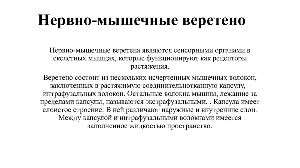 Нервно-мышечные веретена являются сенсорными органами в скелетных мышцах, которые функционируют как рецепторы растяжения. Веретено состоит из нескольких исчерченных мышечных волокон, заключенных в растяжимую соединительнотканную капсулу, - интрафузальных волокон. Остальные волокна мышцы, лежащие за пределами капсулы, называются экстрафузальными.. Капсула имеет слоистое строение. В ней различают наружные и внутренние слои. Между капсулой и интрафузальными волокнами имеется заполненное жидкостью пространство.