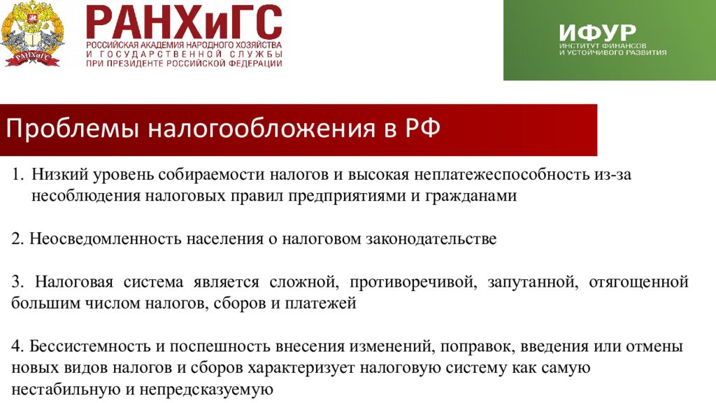 Проблемы налогообложения в РФ Низкий уровень собираемости налогов и высокая неплатежеспособность из-за несоблюдения налоговых правил предприятиями и гражданами 2. Неосведомленность населения о налоговом законодательстве 3. Налоговая система является сложной, противоречивой, запутанной, отягощенной большим числом налогов, сборов и платежей 4. Бессистемность и поспешность внесения изменений, поправок, введения или отмены новых видов налогов и сборов характеризует налоговую систему как самую нестабильную и непредсказуемую