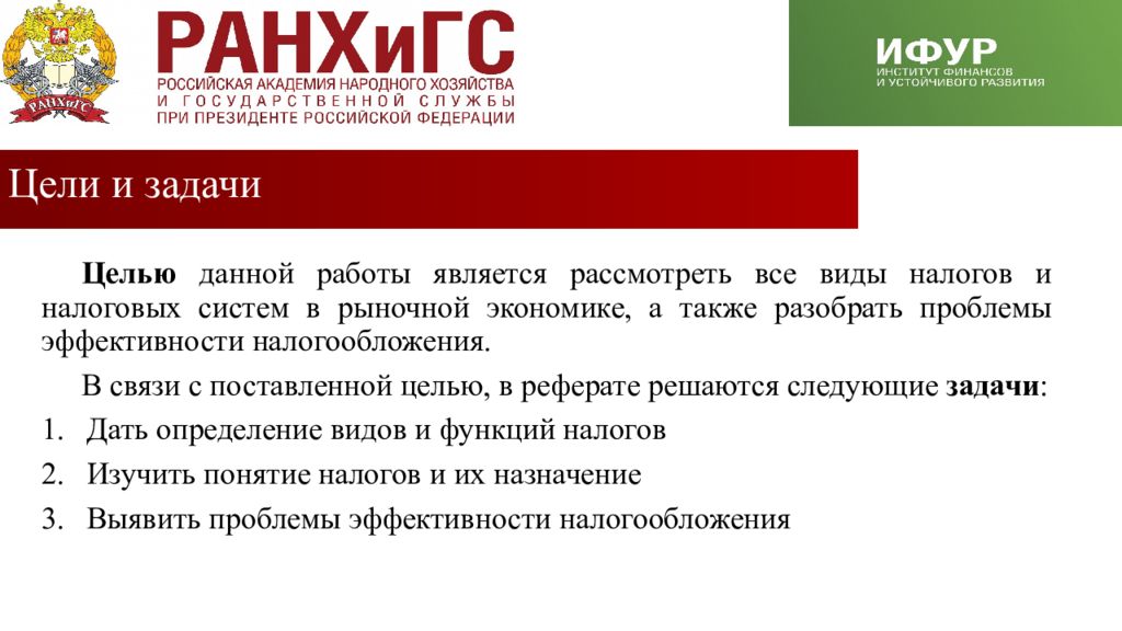 Целью данной работы является рассмотреть все виды налогов и налоговых систем в рыночной экономике, а также разобрать проблемы эффективности налогообложения. В связи с поставленной целью, в реферате решаются следующие задачи : Дать определение видов и функций налогов Изучить понятие налогов и их назначение Выявить проблемы эффективности налогообложения Цели и задачи