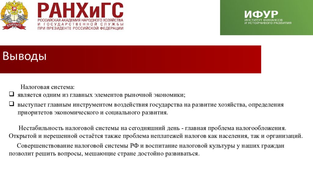 Выводы Налоговая система: является одним из главных элементов рыночной экономики; выступает главным инструментом воздействия государства на развитие хозяйства, определения приоритетов экономического и социального развития. Нестабильность налоговой системы на сегодняшний день - главная проблема налогообложения. Открытой и нерешенной остаётся также проблема неплатежей налогов как населения, так и организаций. Совершенствование налоговой системы РФ и воспитание налоговой культуры у наших граждан позволит решить вопросы, мешающие стране достойно развиваться.