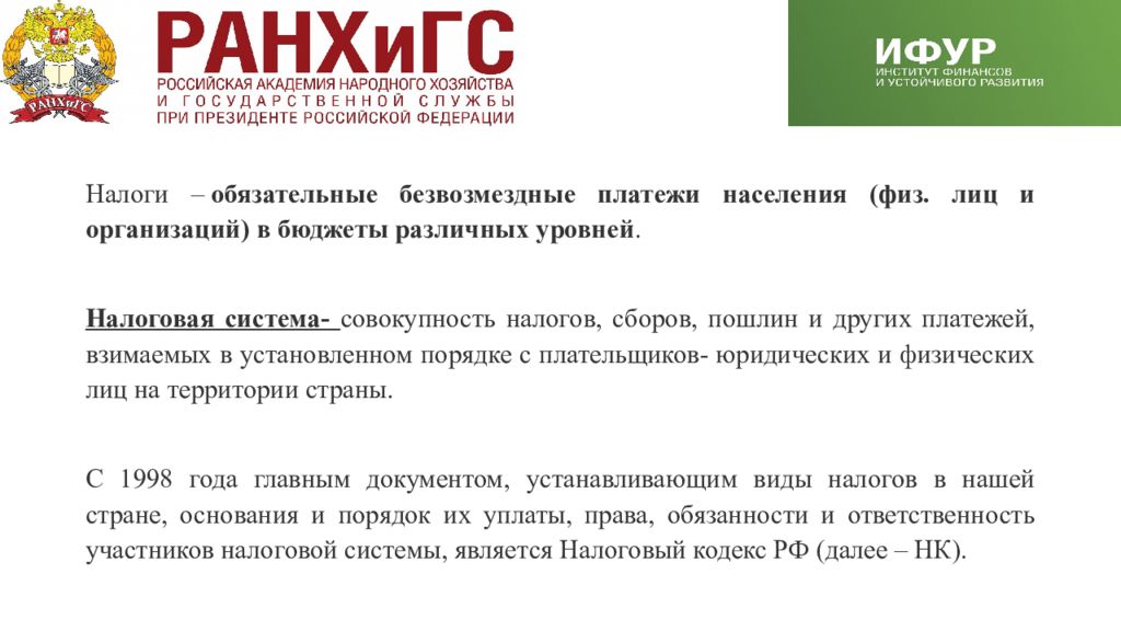 Налоги – обязательные безвозмездные платежи населения (физ. лиц и организаций) в бюджеты различных уровней. Налоговая система- совокупность налогов, сборов, пошлин и других платежей, взимаемых в установленном порядке с плательщиков- юридических и физических лиц на территории страны. С 1998 года главным документом, устанавливающим виды налогов в нашей стране, основания и порядок их уплаты, права, обязанности и ответственность участников налоговой системы, является Налоговый кодекс РФ (далее – НК).