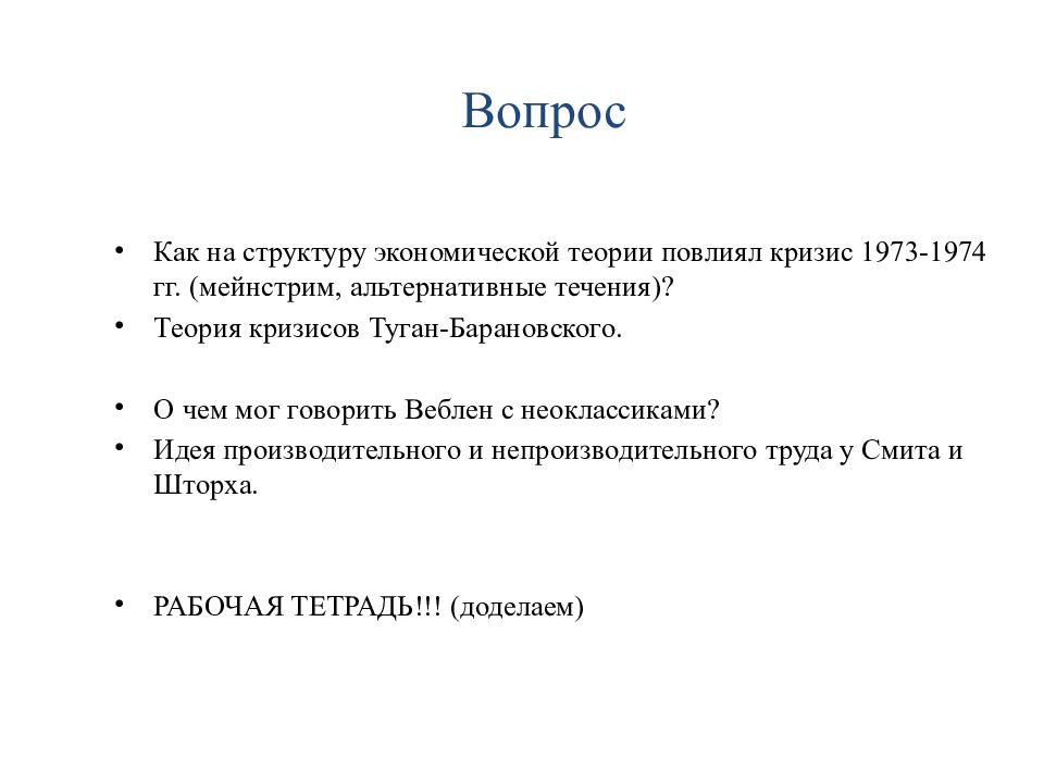 Как на структуру экономической теории повлиял кризис 1973-1974 гг. (мейнстрим, альтернативные течения)? Теория кризисов Туган-Барановского. О чем мог говорить Веблен с неоклассиками? Идея производительного и непроизводительного труда у Смита и Шторха. РАБОЧАЯ ТЕТРАДЬ!!! (доделаем)