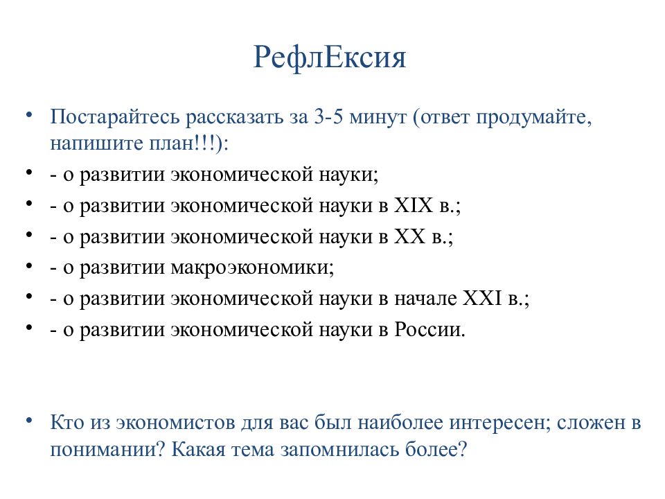 Постарайтесь рассказать за 3-5 минут (ответ продумайте, напишите план!!!): - о развитии экономической науки; - о развитии экономической науки в XIX в.; - о развитии экономической науки в XX в.; - о развитии макроэкономики; - о развитии экономической науки в начале XXI в.; - о развитии экономической науки в России. Кто из экономистов для вас был наиболее интересен; сложен в понимании? Какая тема запомнилась более?