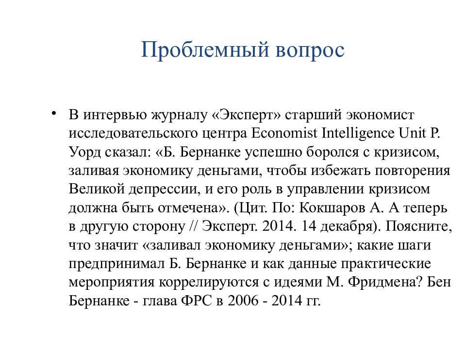 В интервью журналу «Эксперт» старший экономист исследовательского центра Economist Intelligence Unit Р. Уорд сказал: «Б. Бернанке успешно боролся с кризисом, заливая экономику деньгами, чтобы избежать повторения Великой депрессии, и его роль в управлении кризисом должна быть отмечена». (Цит. По: Кокшаров А. А теперь в другую сторону // Эксперт. 2014. 14 декабря). Поясните, что значит «заливал экономику деньгами»; какие шаги предпринимал Б. Бернанке и как данные практические мероприятия коррелируются с идеями М. Фридмена? Бен Бернанке - глава ФРС в 2006 - 2014 гг.