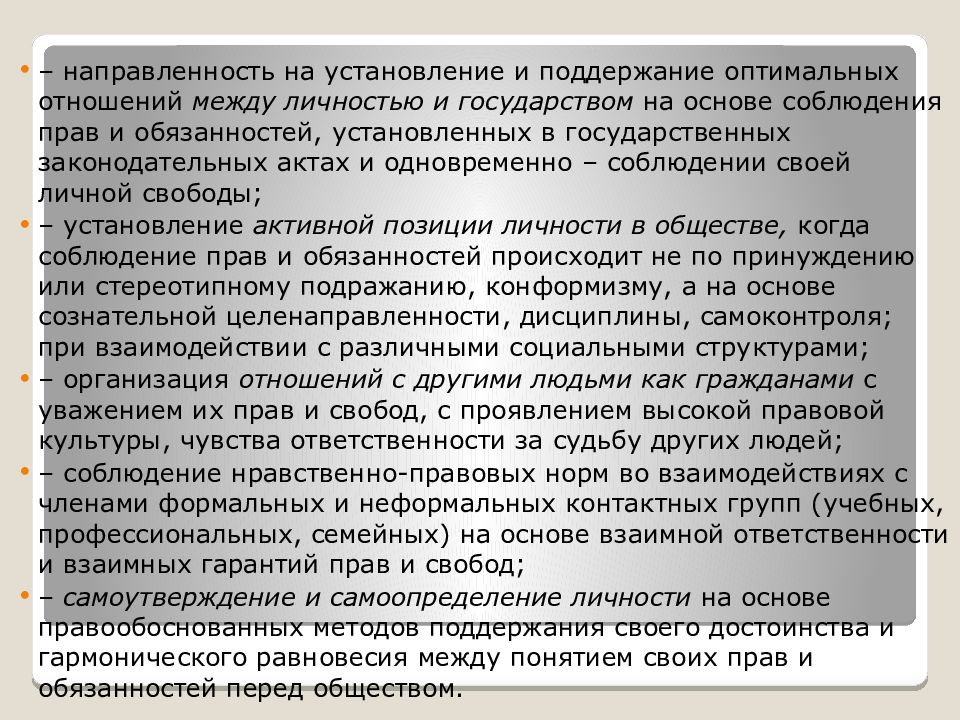 – направленность на установление и поддержание оптимальных отношений между личностью и государством на основе соблюдения прав и обязанностей, установленных в государственных законодательных актах и одновременно – соблюдении своей личной свободы; – установление активной позиции личности в обществе, когда соблюдение прав и обязанностей происходит не по принуждению или стереотипному подражанию, конформизму, а на основе сознательной целенаправленности, дисциплины, самоконтроля; при взаимодействии с различными социальными структурами; – организация отношений с другими людьми как гражданами с уважением их прав и свобод, с проявлением высокой правовой культуры, чувства ответственности за судьбу других людей; – соблюдение нравственно-правовых норм во взаимодействиях с членами формальных и неформальных контактных групп (учебных, профессиональных, семейных) на основе взаимной ответственности и взаимных гарантий прав и свобод; – самоутверждение и самоопределение личности на основе правообоснованных методов поддержания своего достоинства и гармонического равновесия между понятием своих прав и обязанностей перед обществом.