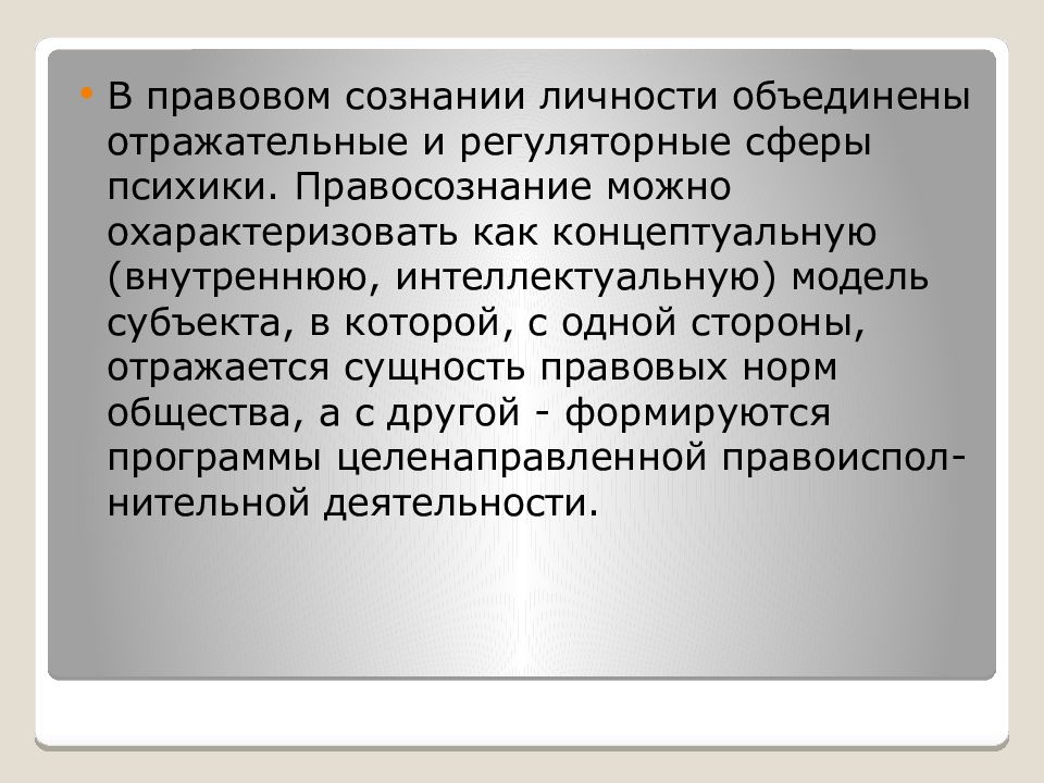 В правовом сознании личности объединены отражательные и регуляторные сферы психики. Правосознание можно охарактеризовать как концептуальную (внутреннюю, интеллектуальную ) модель субъекта, в которой, с одной стороны, отражается сущность правовых норм общества, а с другой - формируются программы целенаправленной правоиспол-нительной деятельности.