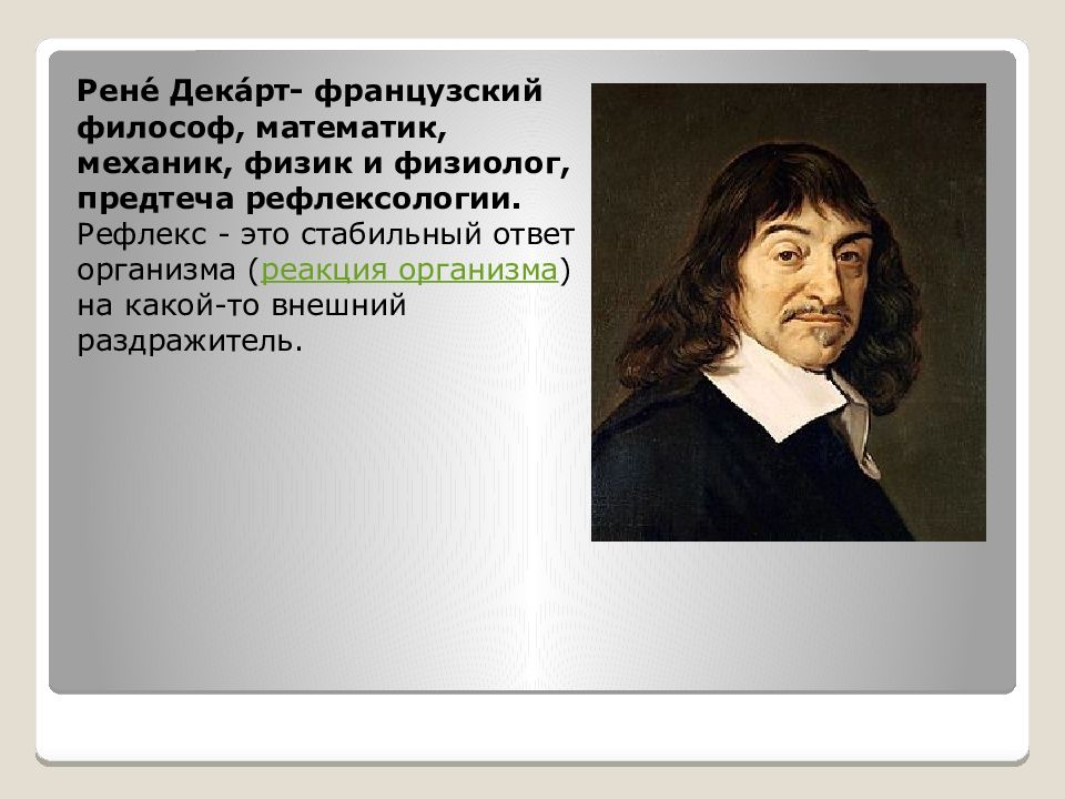 Рене́ Дека́рт - французский философ, математик, механик, физик и физиолог, предтеча рефлексологии. Рефлекс - это стабильный ответ организма ( реакция организма ) на какой-то внешний раздражитель.