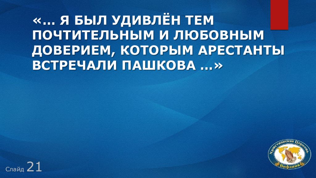 Слайд 21 «… я был удивлён тем почтительным и любовным доверием, которым арестанты встречали Пашкова …»