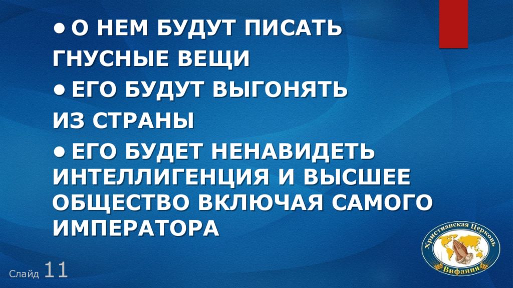 Слайд 11 • О нем будут писать гнусные вещи • Его будут выгонять из страны • Его будет ненавидеть интеллигенция и высшее общество включая самого императора