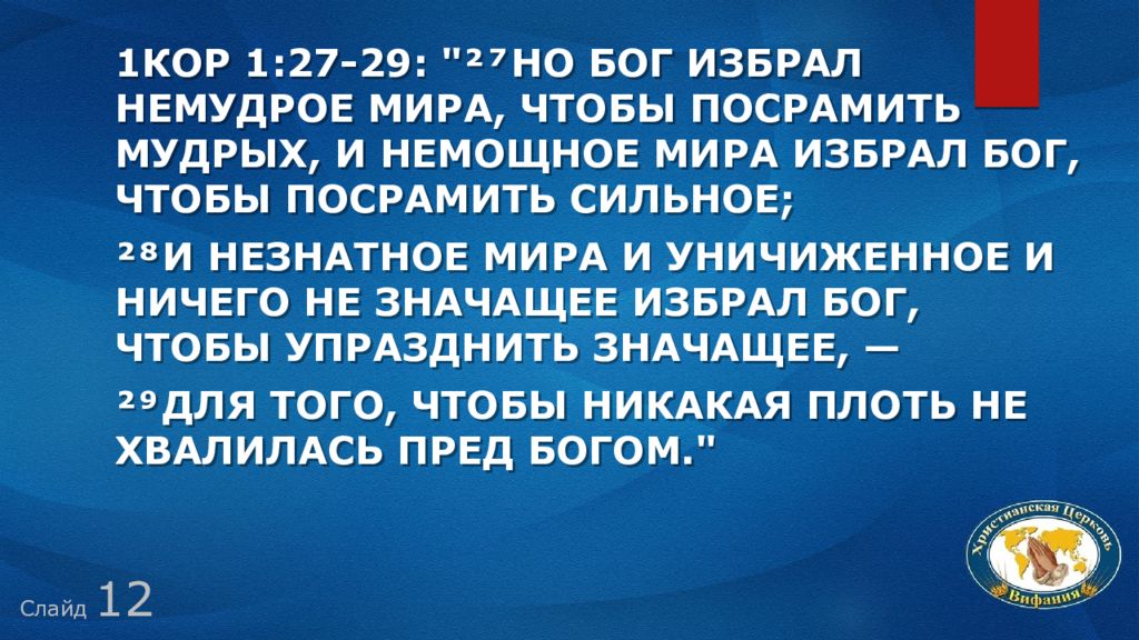 Слайд 12 1Кор 1:27-29: "²⁷ но Бог избрал немудрое мира, чтобы посрамить мудрых, и немощное мира избрал Бог, чтобы посрамить сильное; ²⁸ и незнатное мира и уничиженное и ничего не значащее избрал Бог, чтобы упразднить значащее, — ²⁹ для того, чтобы никакая плоть не хвалилась пред Богом."