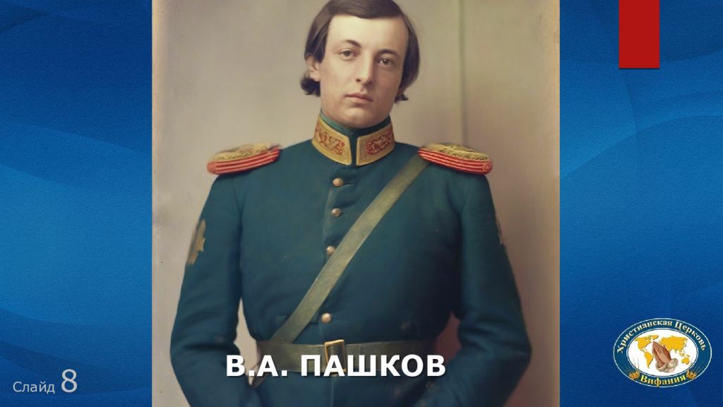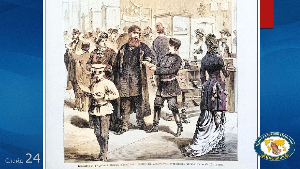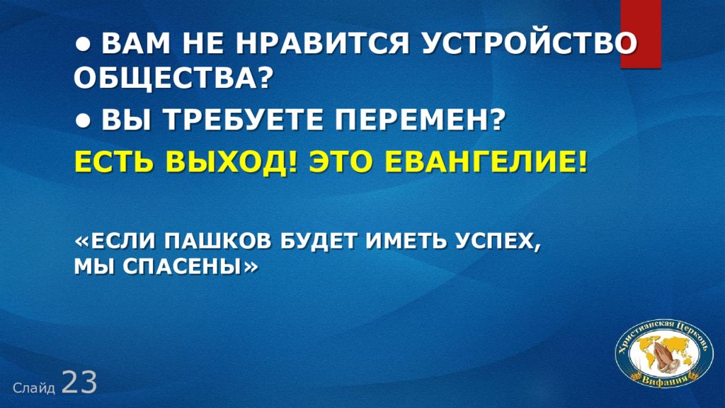 Слайд 23 • Вам не нравится устройство общества? • Вы требуете перемен? Есть выход! Это Евангелие! «Если Пашков будет иметь успех, мы спасены»