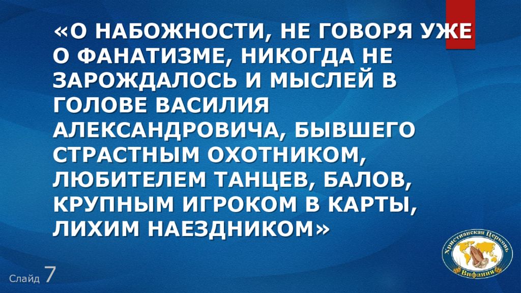 Слайд 7 «О набожности, не говоря уже о фанатизме, никогда не зарождалось и мыслей в голове Василия Александровича, бывшего страстным охотником, любителем танцев, балов, крупным игроком в карты, лихим наездником»