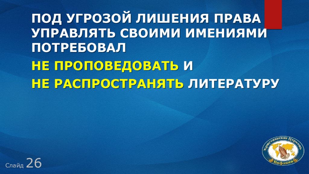 Слайд 26 Под угрозой лишения права управлять своими имениями потребовал не проповедовать и не распространять литературу