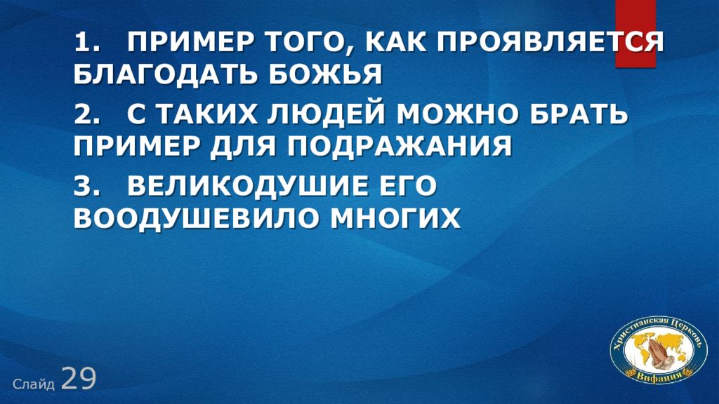 Слайд 29 1. пример того, как проявляется благодать Божья 2. С таких людей можно брать пример для подражания 3. Великодушие его воодушевило многих