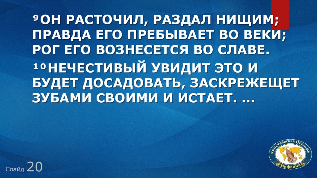 Слайд 20 ⁹ Он расточил, раздал нищим; правда его пребывает во веки; рог его вознесется во славе. ¹⁰ Нечестивый увидит это и будет досадовать, заскрежещет зубами своими и истает....