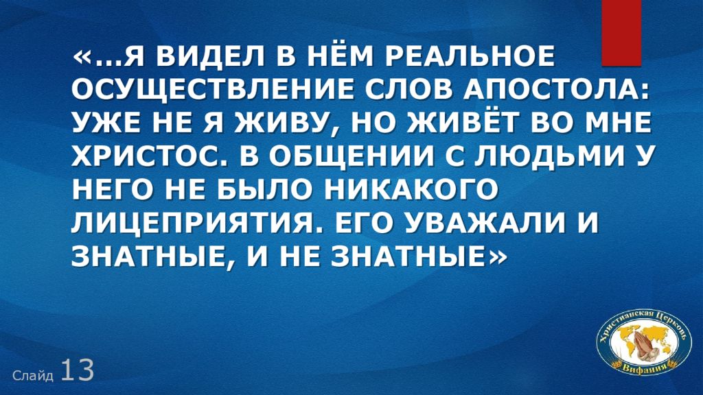 Слайд 13 «…Я видел в нём реальное осуществление слов апостола: Уже не я живу, но живёт во мне Христос. В общении с людьми у него не было никакого лицеприятия. Его уважали и знатные, и не знатные»