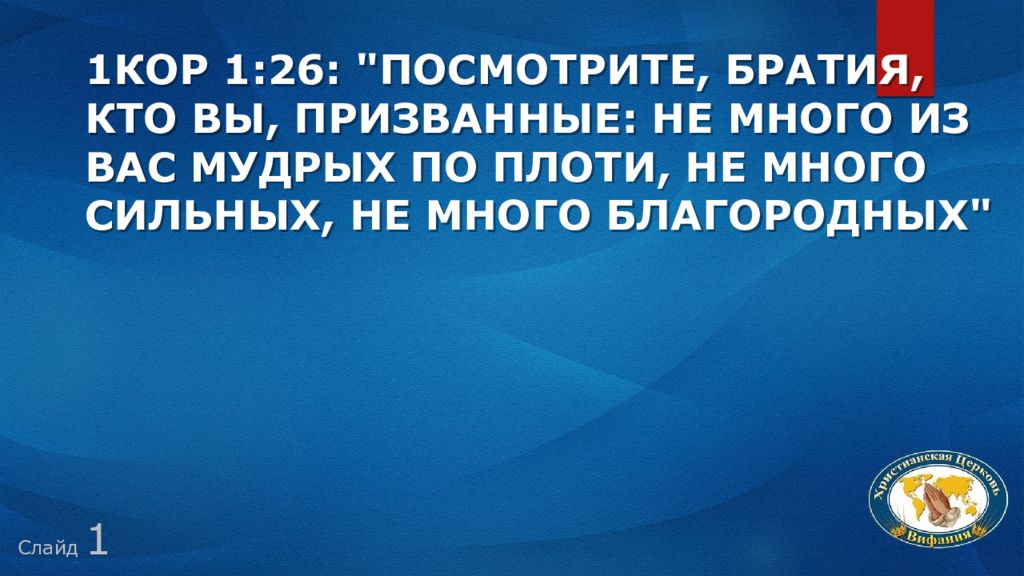 1Кор 1:26: "Посмотрите, братия, кто вы, призванные: не много из вас мудрых по плоти, не много сильных, не много благородных" Слайд 1