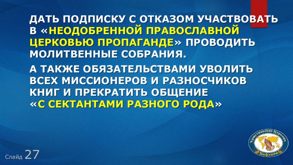 Слайд 27 дать подписку с отказом участвовать в « неодобренной православной церковью пропаганде » проводить молитвенные собрания. а также обязательствами уволить всех миссионеров и разносчиков книг и прекратить общение « с сектантами разного рода »