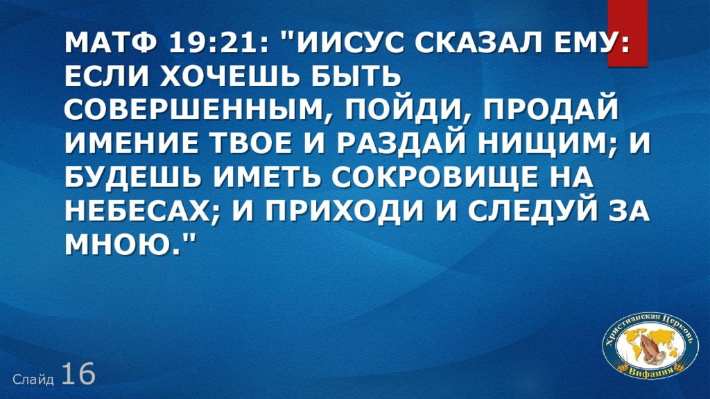 Слайд 1 6 Матф 19:21: "Иисус сказал ему: если хочешь быть совершенным, пойди, продай имение твое и раздай нищим; и будешь иметь сокровище на небесах; и приходи и следуй за Мною."