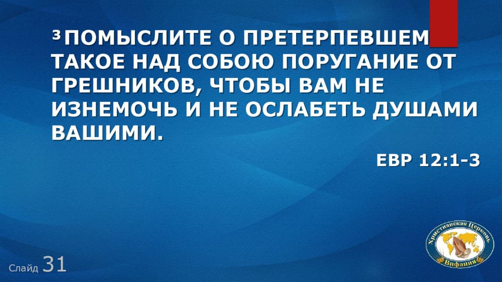 Слайд 3 1 ³ Помыслите о Претерпевшем такое над Собою поругание от грешников, чтобы вам не изнемочь и не ослабеть душами вашими. Евр 12:1-3