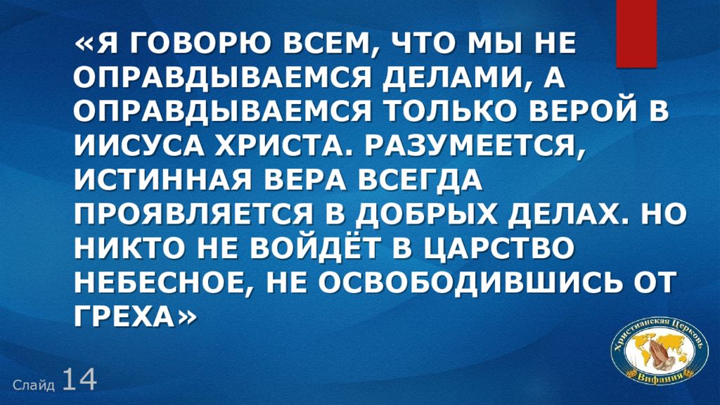 Слайд 14 «Я говорю всем, что мы не оправдываемся делами, а оправдываемся только верой в Иисуса Христа. Разумеется, истинная вера всегда проявляется в добрых делах. Но никто не войдёт в царство небесное, не освободившись от греха»