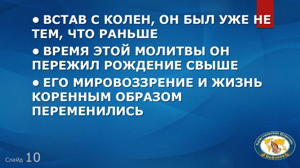 Слайд 10 • Встав с колен, он был уже не тем, что раньше • Время этой молитвы он пережил рождение свыше • его мировоззрение и жизнь коренным образом переменились