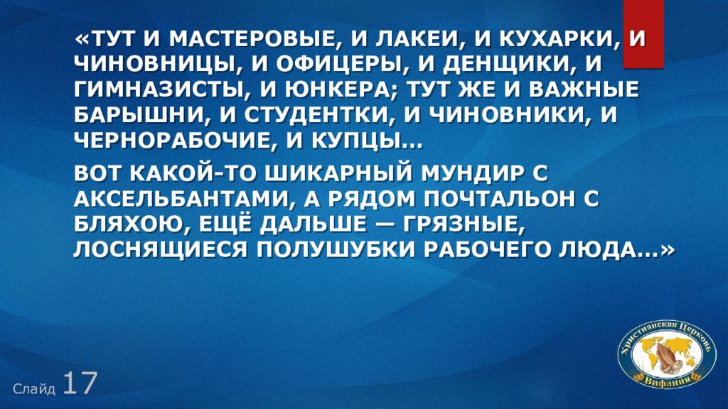 Слайд 1 7 «Тут и мастеровые, и лакеи, и кухарки, и чиновницы, и офицеры, и денщики, и гимназисты, и юнкера; тут же и важные барышни, и студентки, и чиновники, и чернорабочие, и купцы… Вот какой-то шикарный мундир с аксельбантами, а рядом почтальон с бляхою, ещё дальше — грязные, лоснящиеся полушубки рабочего люда…»